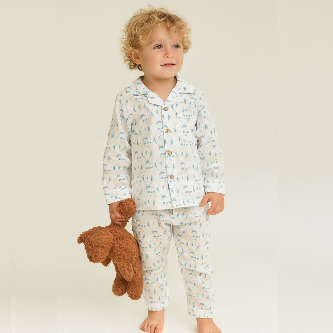 In puro cotone il pigiamino fish&bubbles è disegnato in esclusiva da Dragonfly Firenze e stampato a mano con la tecnica hand block su pura garza di cotone traspirante. Perfettamente rifiniti e confezionati uno ad uno, i pigiami ricalcano il modello classico, con la giacchina a reverse con l'abbottonatura sul fronte e le maniche lunghe. I pantaloni, anche questi lunghi, hanno un morbido elastico in vita, i bottoni dei pigiami sono in pasta di legno di cocco, la sacchettina nello stesso tessuto coordinato è inclusa.